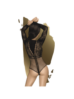 Le teddy séduisant est fait d'un filet à mailles fines à motif floral. La zone opaque sur le décolleté apporte ce petit plus de piquant à votre amoureux. Le design est interrompu par la couture décorative sous la poitrine, qui forme une transition parfaite vers la région inférieure. Sur le bas, le teddy se distingue par son tissu à grosses mailles, qui est souligné par une couture décorative frontale. Les manches longues et le col haut donnent à la lingerie un look élégant mais inaccessible.