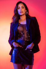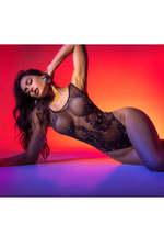 Confectionné en résille noire transparente et extensible, il présente un motif serpent délicatement souligné de strass scintillants, créant un effet lumineux et captivant qui met en valeur les courbes avec précision. Sa coupe près du corps épouse harmonieusement la silhouette, tandis que l’ouverture à l’entrejambe apporte une touche audacieuse et assumée au design.