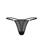 String en mesh noir orné d’une inscription « Make me wet » en strass. Les sangles latérales réglables permettent un ajustement parfait au corps.