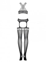 Multiples bretelles qui se croisent dans le dos et sur le décolleté, effet laçage sur l'avant, jolis motifs géométrique et bas ajourés, voici un bodystocking sexy qui a un style de guepiere bas jarretelles sur l'avant et ensemble sexy 3 pieces sur l'arriere. Disponible en grande et parfaitement extensible.