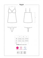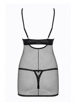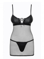 Subtil mélange d'un tissu effet "cuir" et de maille filet, la nuisette dévoile votre peau tandis que le string assorti souligne votre chute de bride.
