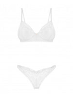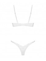Le string et le soutien-gorge de couleur blanche attirent l’attention sur leur caractère universel. Cette lingerie est une composition esthétique de dentelle et de matière lisse et transparente.