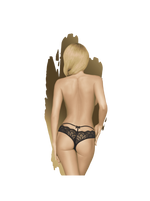 La culotte délicate se niche confortablement autour de vos hanches et offre des coups d'œil excitants grâce à la coupe serrée à l'arrière. La dentelle en filigrane avec un beau motif et les matériaux doux de haute qualité vous permettront de réaliser n'importe quel fantasme. Le look est complété par des détails de sangles étroites et des applications de nœuds ludiques à l'avant et à l'arrière.